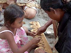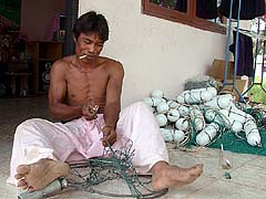 |  Ein Fischer repariert Reuse und Fischernetz für den Einsatz auf den neuen Booten.