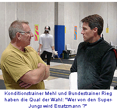 Nur Bundestrainer Rieg hat die Qual der Wahl. Wen in welcher Reihenfolge bringen - wen auf die Ersatzbank schicken. Kothny dürfte als Mittelmann und Punktemacher unumstritten sein, Bauer als zweitbester deutscher Säbel-Olympionike auch, aber ob er mit seinem Trainingsrückstand (Wirbelverletzung) als letzte Mann infrage kommt...? Wenn Eero Lehmann mitficht, wird der Juniorenweltmeister, wie schon in Seoul bei der WM, wohl letzte Mann bleiben, wechselt Jochen Rieg aber Ersatzmann Alexander Weber ein, dürfte auch er - weil ähnlich cool wie Bauer - als Scheuereinfahrer infrage kommen. Nun, Jochen Rieg ist nicht zu beneiden und egal, wie er sich entscheidet, es wird ein enttäuschter Fechter übrigbleiben, es sei denn, er wechselt erst nach dem ersten Kampf den Ersatzmann ein. Das aber könnte sich als Risiko erweisen... Nein, zu beneiden ist er wirklich nicht, der Jochen Rieg, auch wenn es nach dem Kampf jeder besser gewußt hat.