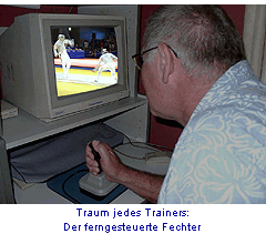 Herzerfrischend, was Sydney 2000 in Sachen Coaching bot: Olympia verwies die Trainer drei Meter von der Bahn und setzten ihnen Aufpasser an die Seite, die sie zur Besonnenheit mahnten, wenn sie sich bei (vermeintlichen) Fehlentscheidungen gestikulierend auf die Obleute stürzen wollten. Fechter waren in Sydney auf sich allein gestellt. Sie mussten mit ihrer Situation allein fertig werden. Einzig und allein aus dem aufmunternden Hop-Hop von dem auf die Zuschauertribüne verwiesenen Matthias Behr konnten sie neue Kraft für neue Aktionen schöpfen.
